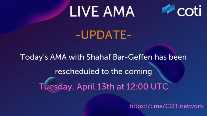 Today's AMA in the COTI Telegram group has been rescheduled to next Tuesday, April 13th at 12:00 UTC.