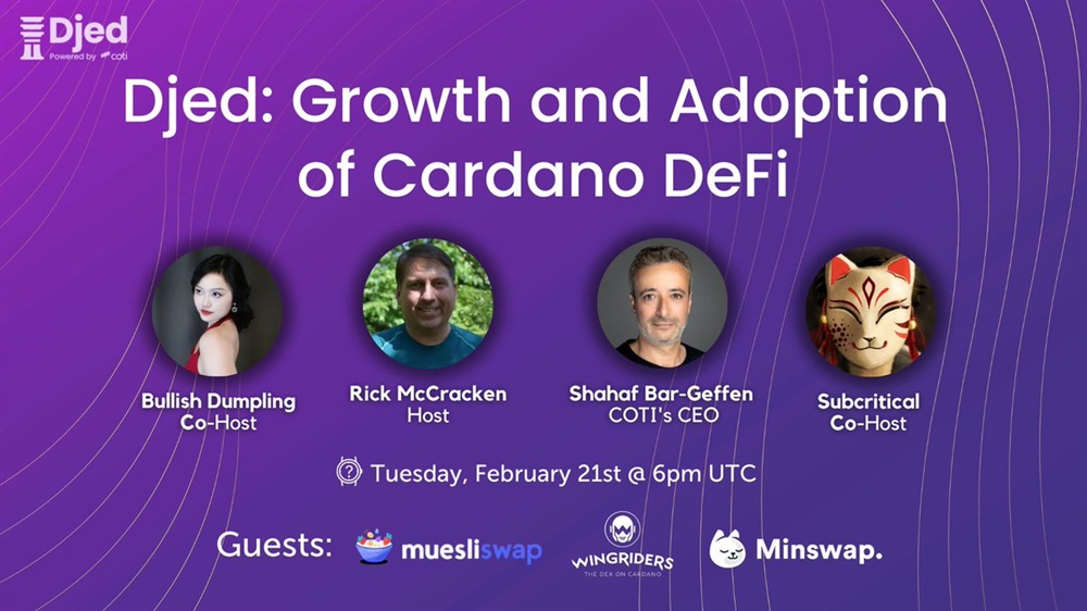 Join us tomorrow on our "Djed: Growth and Adoption of Cardano DeFi" Twitter space hosted by @RichardMcCrackn, @BullishDumpling, and @SubcriticalTV.