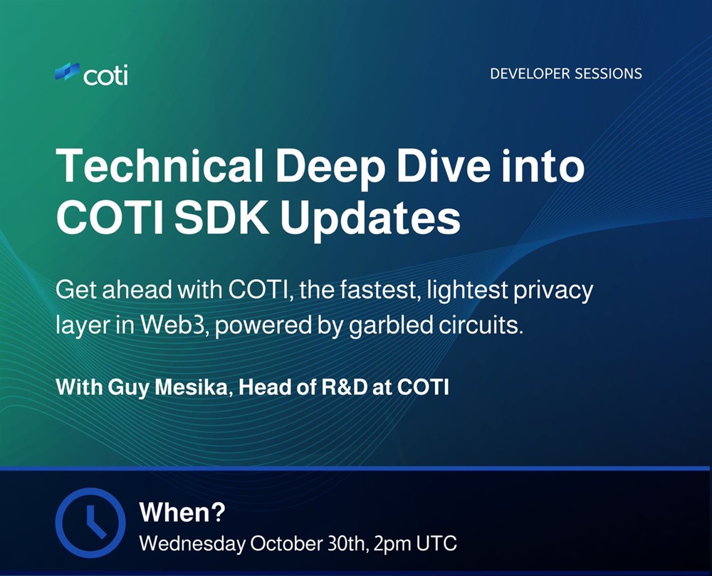 COTI is hosting an AMA on October 30th, to present the latest updates to the SDK, including the release of coti-ethers 1.0.1b and new support for encrypted strings. The event will provide detailed information on the new features and improvements available to developers.