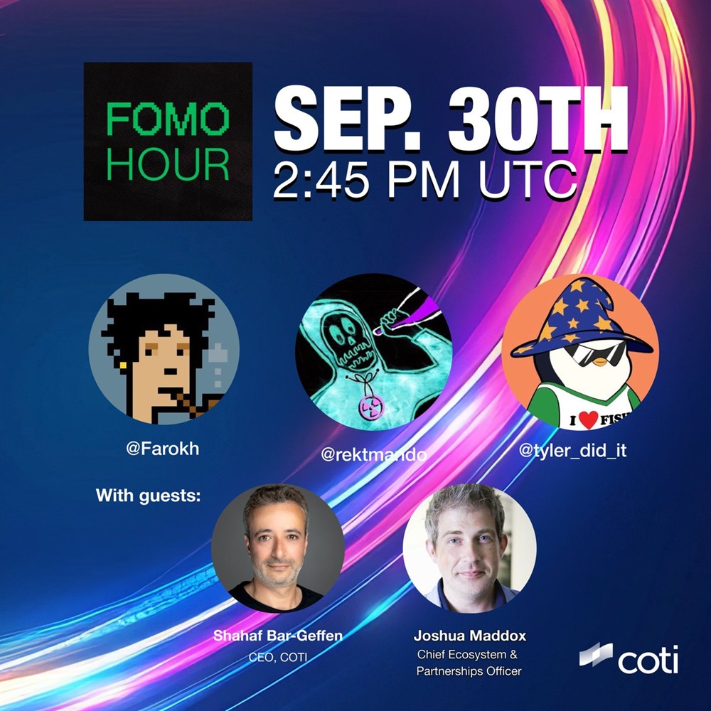 We're looking forward to the FOMO HOUR on monday where Shahaf Bar-Geffen and Joshua Maddox will be discussing the 'new privacy paradigm' with hosts Farokh, Mando and TylerD 🧙♂️ 📢