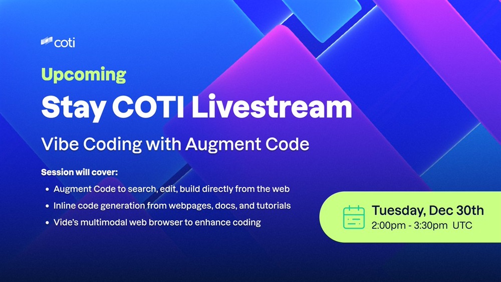 COTI will host a live stream on YouTube on December 30th at 14:00 UTC, dedicated to the use of the Vide AI browser and Augment Code tools for accelerated building and debugging.
