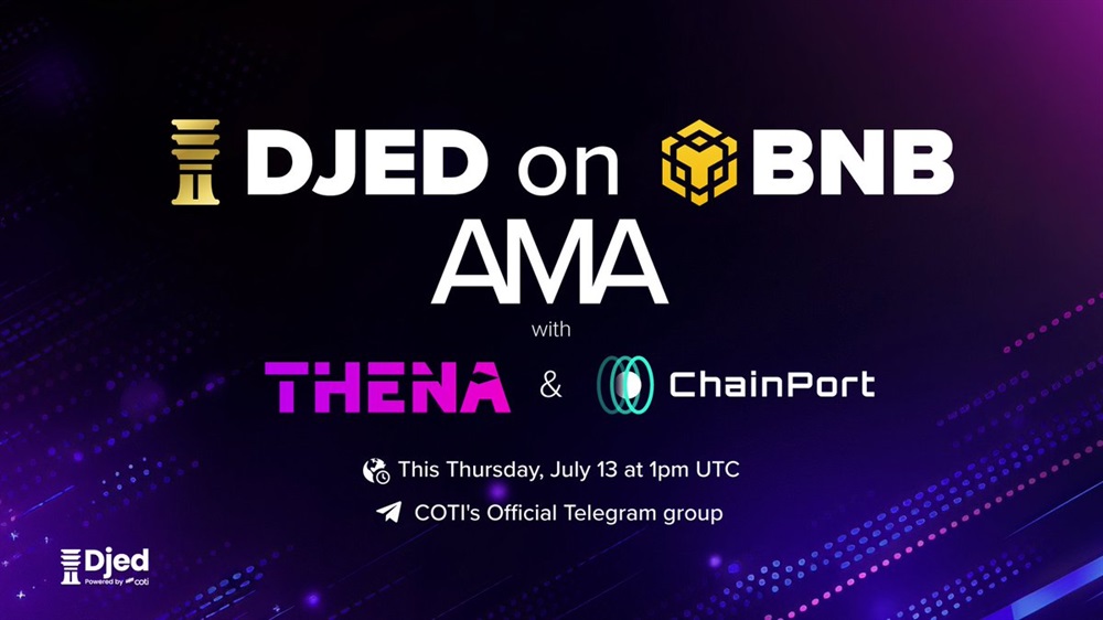 COTI announces an AMA on Telegram, featuring special guests from ChainPort and Thena. The discussion will be based on the topic “DJED on BNB” and related issues.