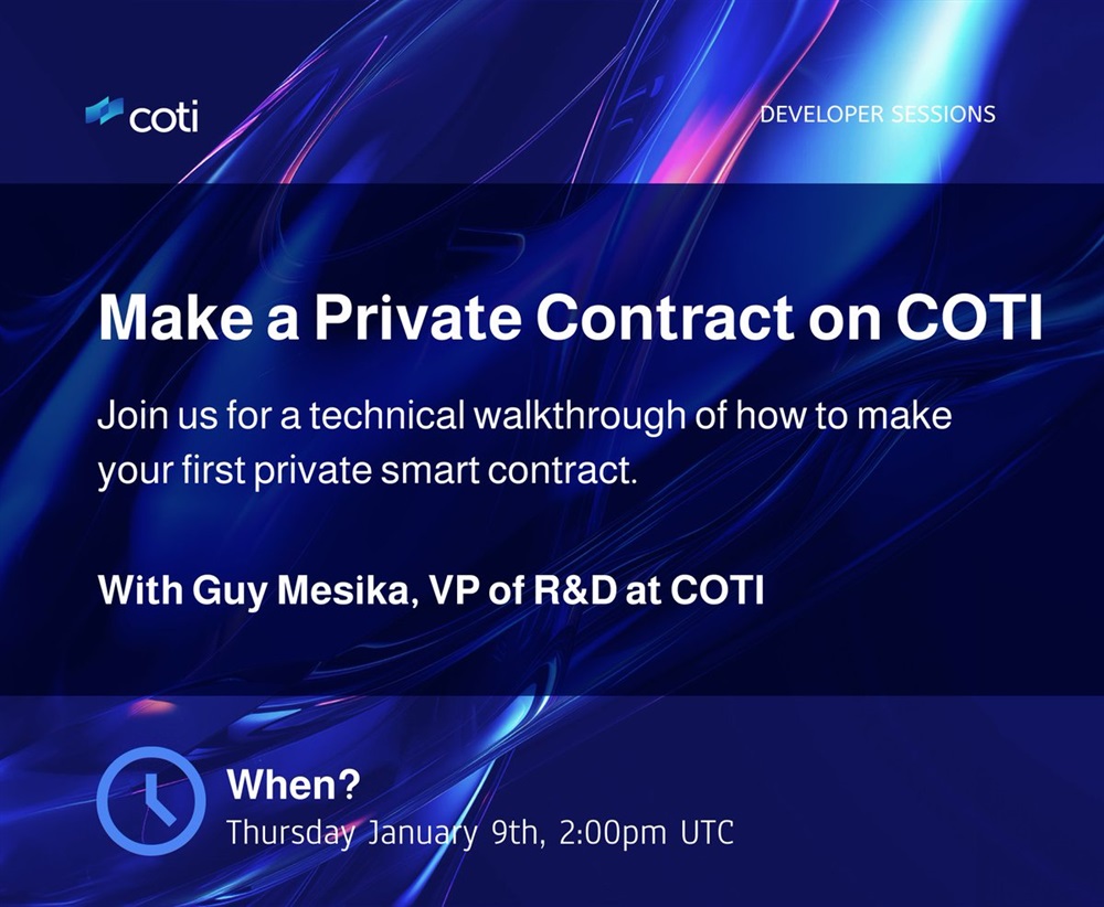 COTI will host a community call on January 9th at 2:00 pm UTC, focusing on creating private smart contracts on its platform. The session will provide step-by-step instruction on building privacy-preserving contracts.