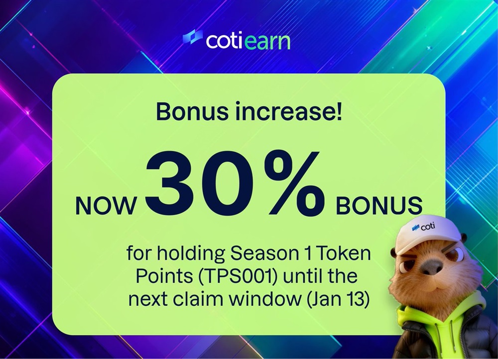 COTI Foundation increases the bonus for holders of COTI Earn Season 1 Token Points (TPS001) from 15% to 30%. The updated bonus applies to users who hold TPS001 until the next claim window, scheduled for January 13, 2026.