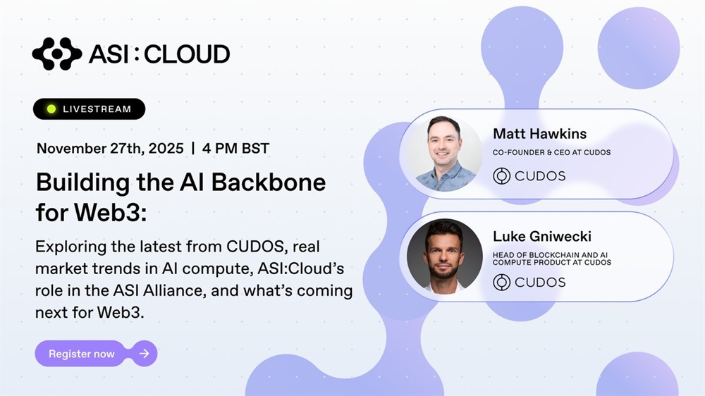 CUDOS schedules a live AMA titled “Building the AI Backbone for Web3” for November 27 at 3 PM UTC. The session features the co-founder, Matt Hawkins and the head of blockchain, Luke Gniwecki, who will discuss ASI.Cloud as the AI compute layer of the ASI Alliance, market trends in decentralized AI infrastructure, and upcoming developments for Web3 compute.
