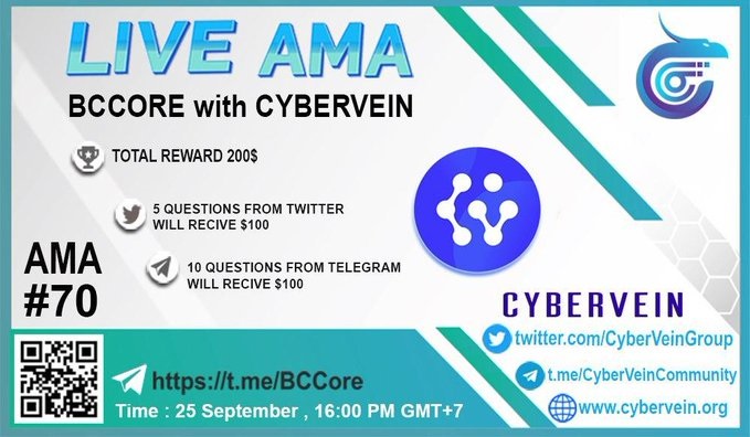 On Friday, We will have an #AMA with @bccorecommunit! The AMA guest will be our CMO Pavel! If you are interested in our newest progress or have any questions for #CyberVein, you are very welcome to join us! Click the link below to join the AMA group!😎