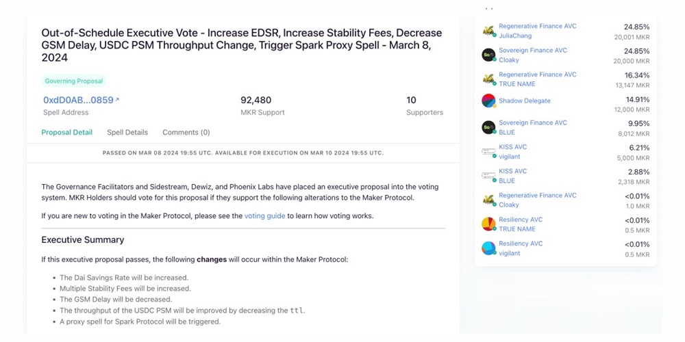 → https://vote.makerdao.com/executive/template-executive-vote-out-of-schedule-executive-vote-increase-edsr-increase-stability-fees-decrease-gsm-delay-usdc-psm-throughput-change-trigger-spark-proxy-spell-march-8-2024