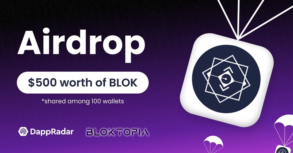 DappRadar, in collaboration with Bloktopia, will be hosting an airdrop of $500 worth of BLOK tokens. The airdrop will be shared equally among 100 fortunate winners.