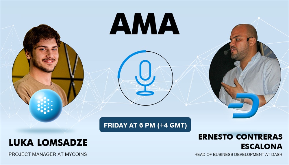 Join us this Friday at 6pm GMT+4, 10am EST for a discussion between Dash Core Group's Head of Business Development, Ernesto Contreras, and MyCoins Heavy Weight, Luka Lomsadze, as they discuss crypto, Dash, MyCoins, and today's trends.