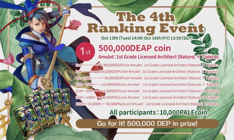 The ranking will be determined by the amount of PALEcoin obtained by trying to do a special quest. You can receive a large sum of DEAPcoin (DEP) and rare items depending on your ranking at the final time of the event. In this ranking event, the opponent’s deck does not include the ”water” and ”Poison” amulets, so having the ”fire” and ”earth ” amulets in your deck will be beneficial in the battle. Also, the more you complete the stage and the higher the level of difficulty, the more PALEcoin you can get.
