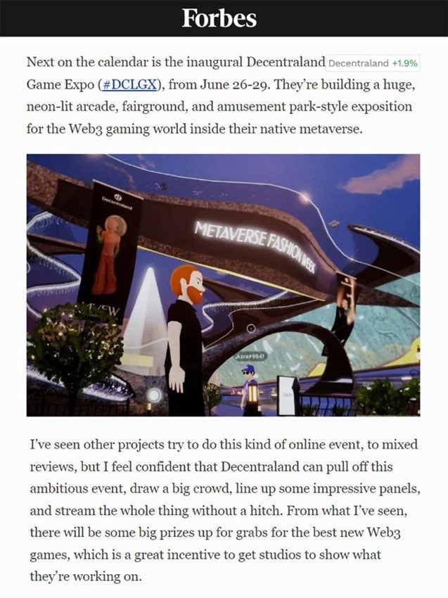 Support for the upcoming Decentraland Game Expo spotted in Forbes 🎉