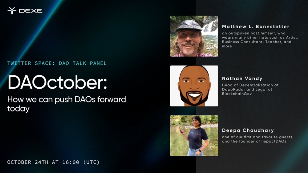 DeXe will host an AMA on X on October 24th at 16:00 UTC. The discussion will focus on the topic “DAOctober: How we can push DAOs forward today”.