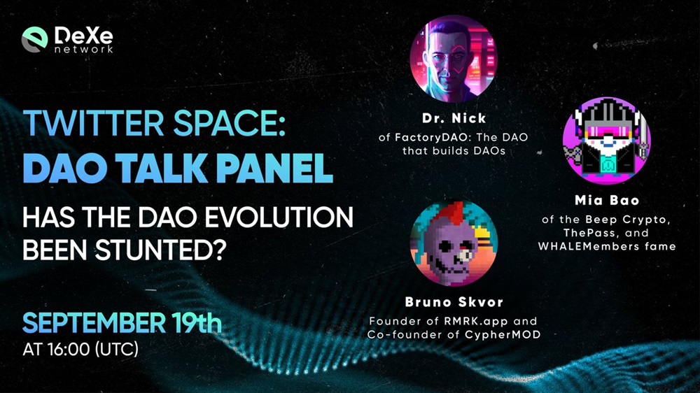 DeXe will host an AMA on X on September 19th at 16:00 UTC. The discussion will revolve around the topic: Has the DAO evolution been stunted?