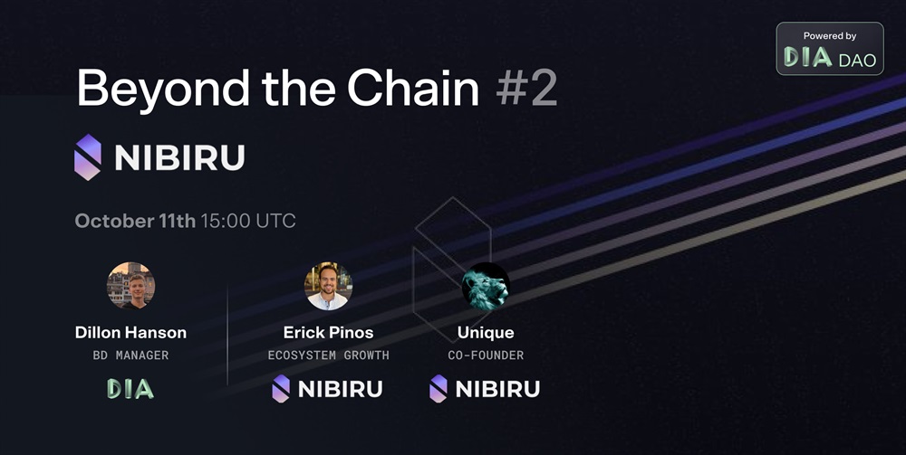 DIA will host an AMA on X to delve into the future of smart contracts on October 11th. The co-founder of Nibiru Chain and the ecosystem lead will be joining the discussion. The focus of the conversation will be on the innovative aspects of the Nibiru Chain.