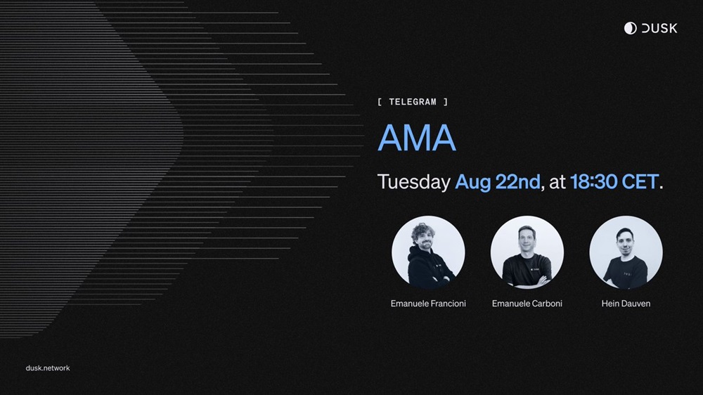DUSK Network will host an AMA on Telegram on August 22nd at 16:30 UTC. The session will feature the CEO and founder Emanuele Francioni, head of operations Hein Dauven, and CMO Emanuele Carboni.