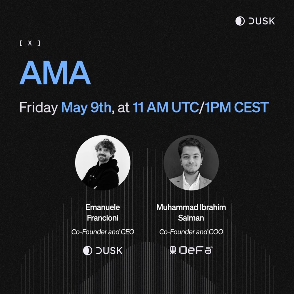 DUSK Network will host an AMA on X with DeFa, a decentralized factoring project developed by InvoiceMate, on May 9th at 11:00 UTC. The discussion is expected to examine on-chain invoicing and its role within real-world assets.