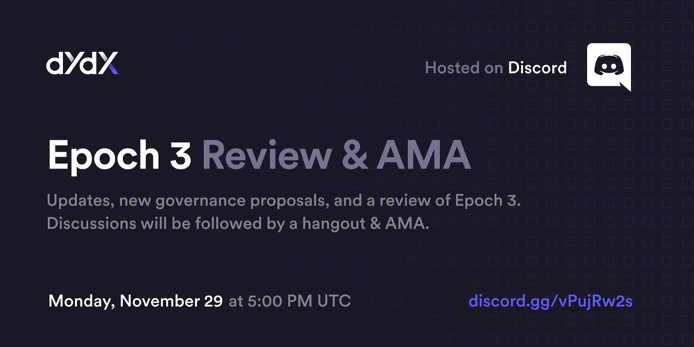 @dydxfoundation will be hosting a discussion on Discord on Monday (11/29) at 17:00 UTC regarding general updates, current governance proposals and an Epoch 3 review.