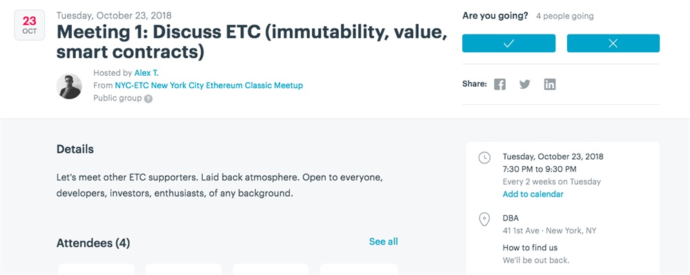 Let's meet other ETC supporters. Laid back atmosphere. Open to everyone, developers, investors, enthusiasts, of any background.