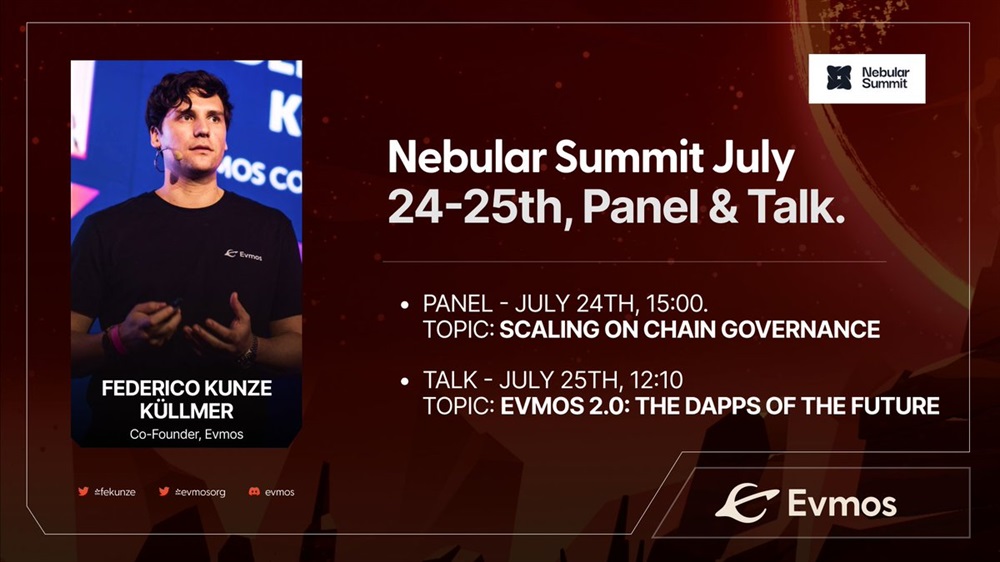 Evmos is set to participate in the Nebular Summit taking place in Paris, France from July 23 to July 25, 2023. The summit will feature a panel discussion on “Scaling On-Chain Governance” on July 24 at 15:00 UTC, where Federico Kunze from Evmos will be a panelist.