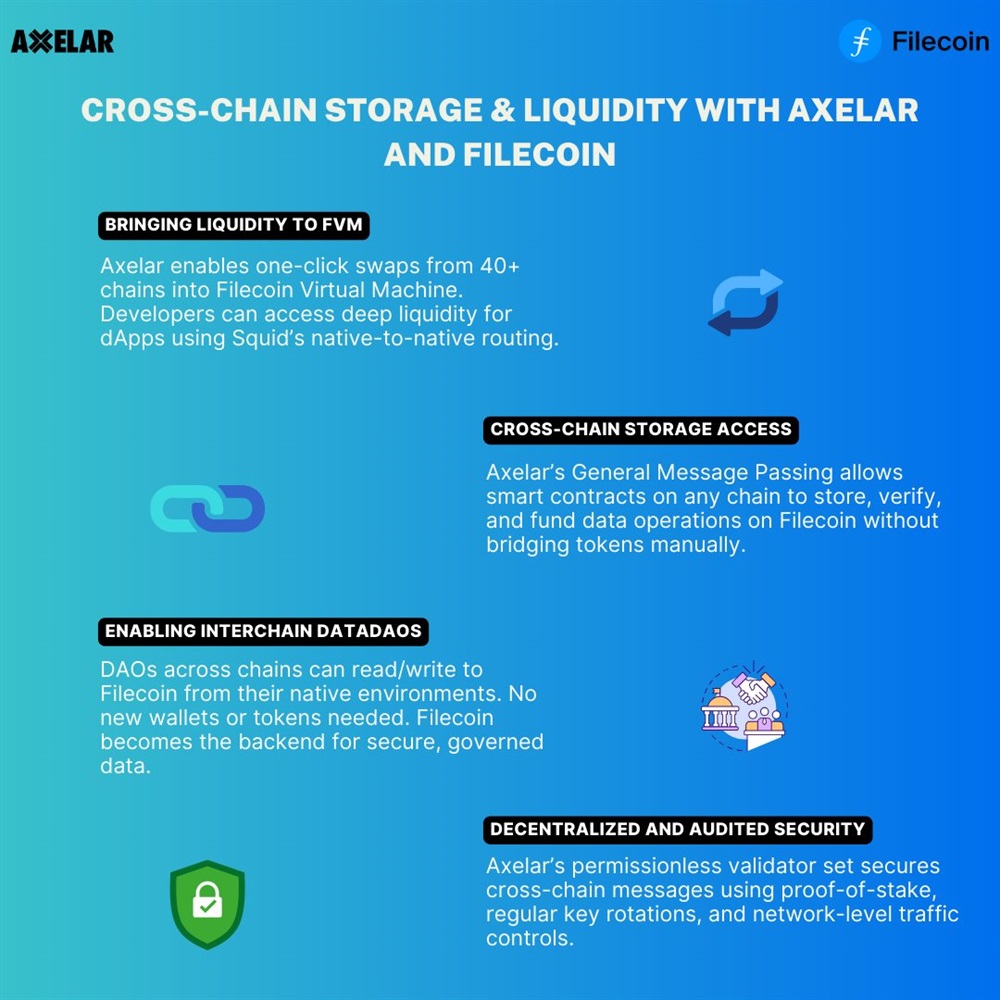Filecoin and Axelar Network are collaborating to enable cross-chain storage and liquidity for the Filecoin Virtual Machine. Developers will be able to store, verify, and fund data on Filecoin from any connected chain using Axelar’s General Message Passing.