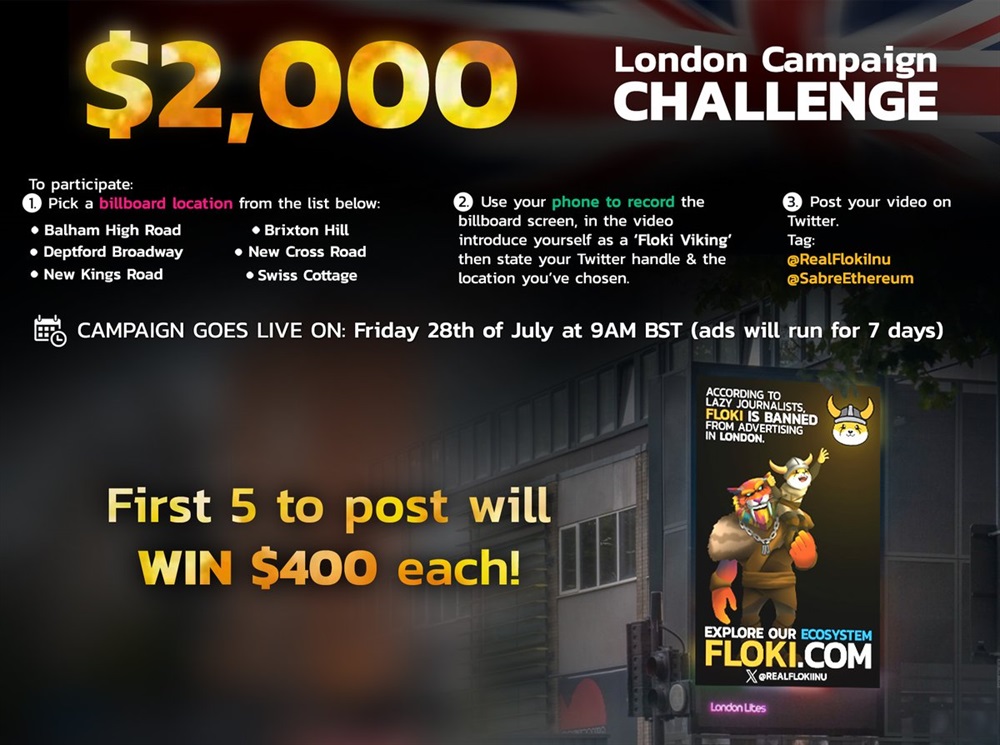 FLOKI will launch a marketing campaign in London. The event will start on July 28th at 8:00 UTC and will run for a period of seven days. The campaign will feature FLOKI’s advertisements on six strategically placed billboards across the city. Participants who publish the first 5 posts with one of the billboards will receive $400 each.
