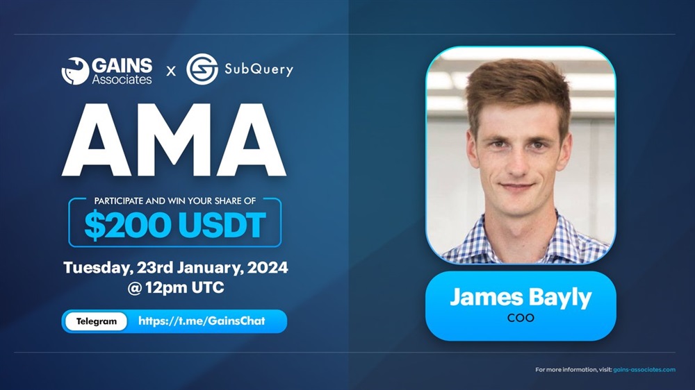 Gains will host an AMA on Telegram with SubQuery on January 23rd at 12:00 UTC. The event will include a quiz., where participants have a chance to win 200 USDT.
