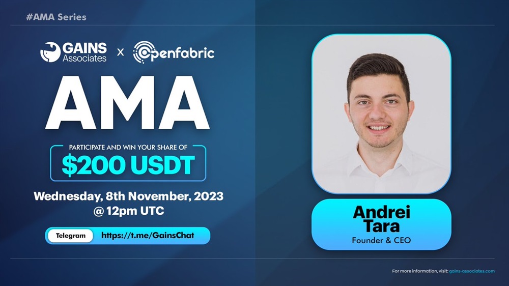 Gains will host an AMA on Telegram featuring the founder and CEO Andrei Tara from OpenFabric. The event will take place on the 8th of November at 12:00 UTC.