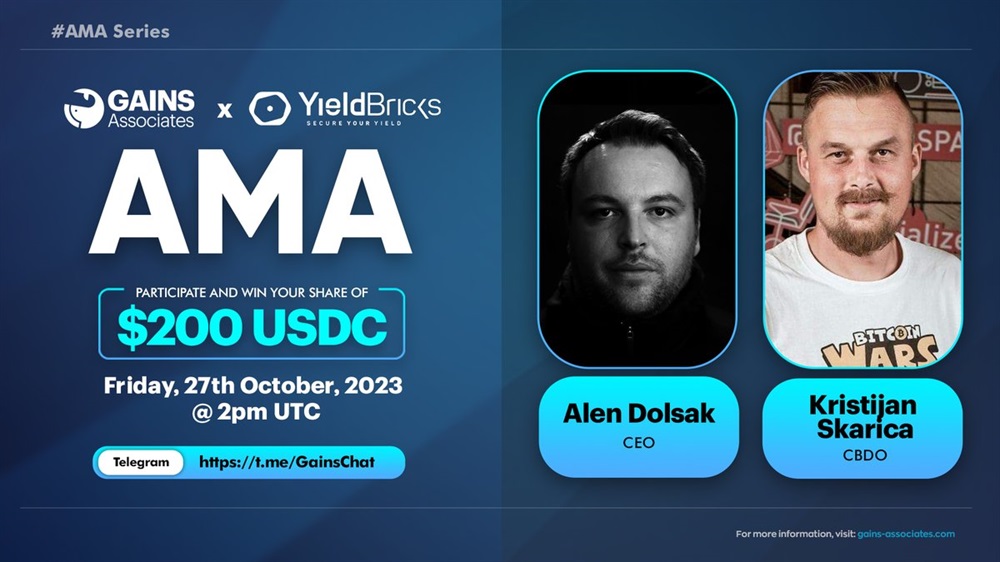 Gains will host an AMA on Telegram with YieldBricks on October 27th at 14:00 UTC. The event will also feature a prize of $200 USDT.