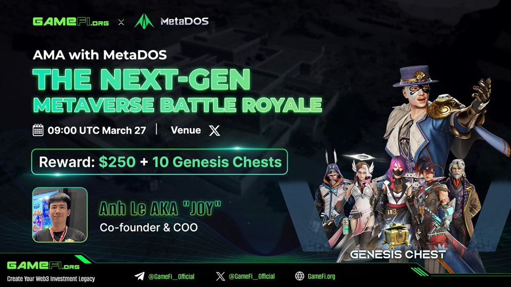 GameFi will host an AMA on X with MetaDOS on March 27th a 9:00 UTC. The guest will be Anh Le, the co-founder and COO of MetaDOS.