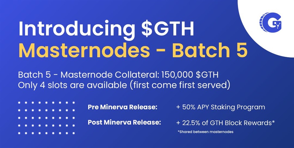 For the 5th batch, masternode collateral is 150,000 $GTH & 4 slots are available; cloud gross profits are excluded.