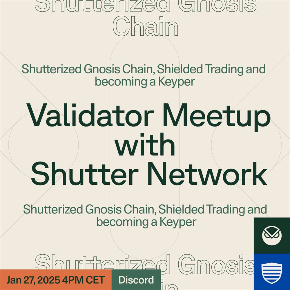 Gnosis will host the validator meetup on Discord in collaboration with Shutter on January 27th at 3:00 PM UTC. The call will focus on the latest Shutterized Gnosis Chain updates, shielded trading on Gnosis, new client implementations, and upcoming Pectra upgrades on the Gnosis Chain.
