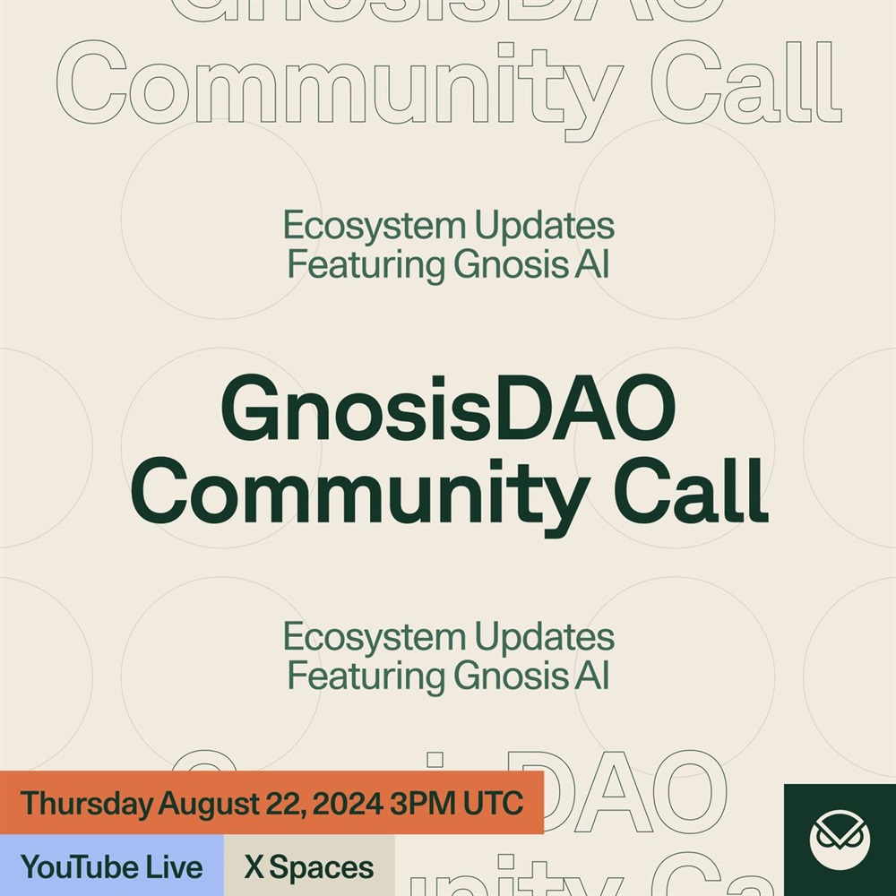 Gnosis is set to host a community call featuring updates from the Gnosis ecosystem and a special presentation by the Gnosis AI team. The Gnosis AI team is primarily focused on agent-to-agent payments and prediction markets. Their ultimate goal is to establish Gnosis as the Schelling point for AI agents in the web3 environment. The community call is scheduled to take place on August 22nd at 3 PM UTC.