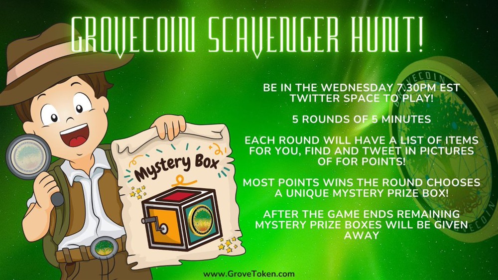 Join the Wednesday April 19th Twitter Space with @srrono & @JustAman04 for a #GroveGreenArmy scavenger hunt!