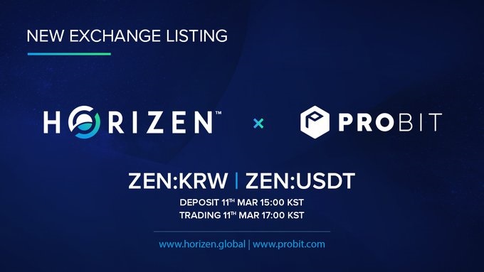 #Horizen is now listed on @ProBit_Exchange. Get $ZEN with KRW and USDT trading pairs starting March 11th!