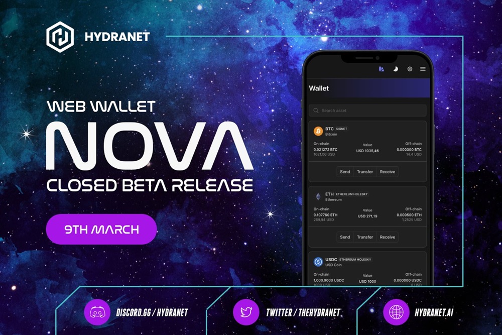 Hydranet will release closed beta web wallet NOVA on March 9th. This Web3 wallet will allow users to interact with Bitcoin and various other EVM assets seamlessly.