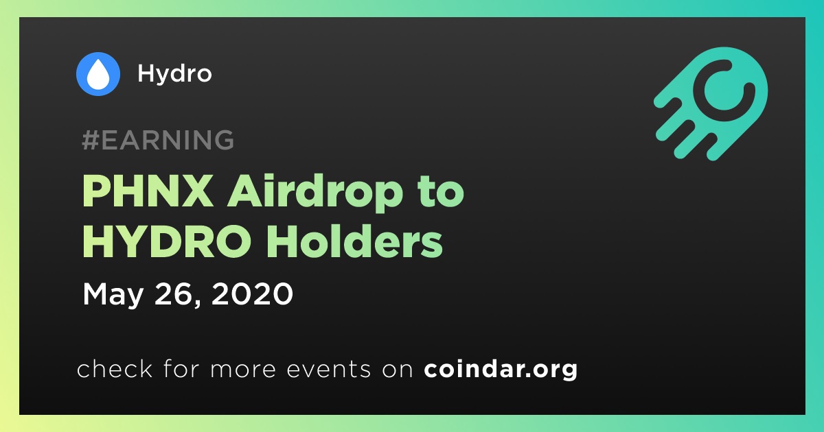 If you have a Hydro (HYDRO) balance on Bittrex Global on May 26th, 2020 snapshot, you will be credited the equivalent amount of PHNX airdrop tokens on a 100:1 basis. i.e. 100 HYDRO on Bittrex Global held during the on-exchange snapshot will give you 1 PHNX airdrop token. Only the HYDRO held on your account is eligible for PHNX airdrop tokens.
