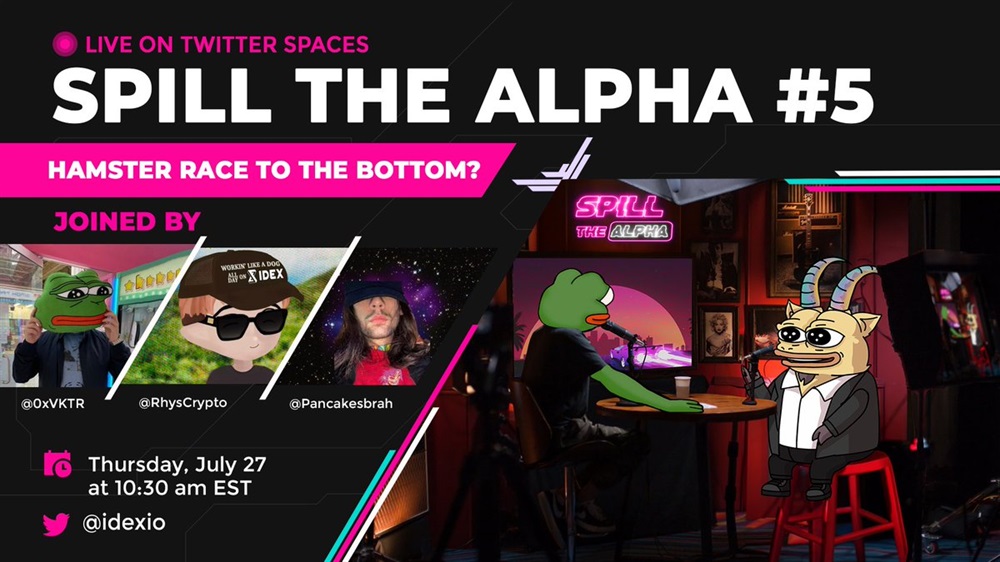 IDEX will host an AMA “Spill the Alpha” on Twitter. The event is scheduled for July 27th at 14:30 UTC. The team will be discussing the current market trends, “hamster races”, and the recently announced XCHAIN.