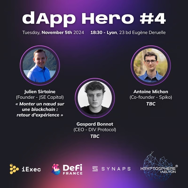 iExec RLC will host a meetup in Lyon on November 5th. This meetup is the fourth in a series entitled “dApp Hero” involving iExec, DeFi France, Synaps, and KryptoSphère Lyon.