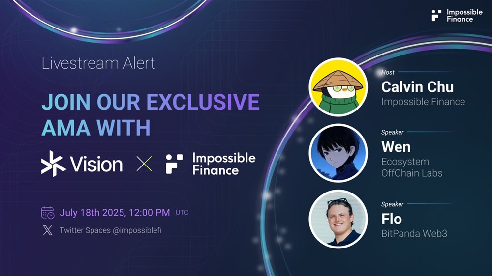 Impossible Decentralized Incubator Access will host a joint AMA with Vision, Off-chainLabs and ImpossibleFi on July 18th, providing an overview of the VSN ecosystem. The session will include discussions among project representatives and a 500 USDT giveaway to be shared among five winners.