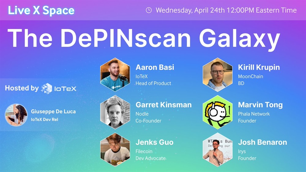 IoTeX will host an AMA on X on April 24th at 16:00 UTC, featuring leading projects from the DePINscan Galaxy. The discussion will cover various topics, including infrastructure, decentralized storage, artificial intelligence, and wireless networks.