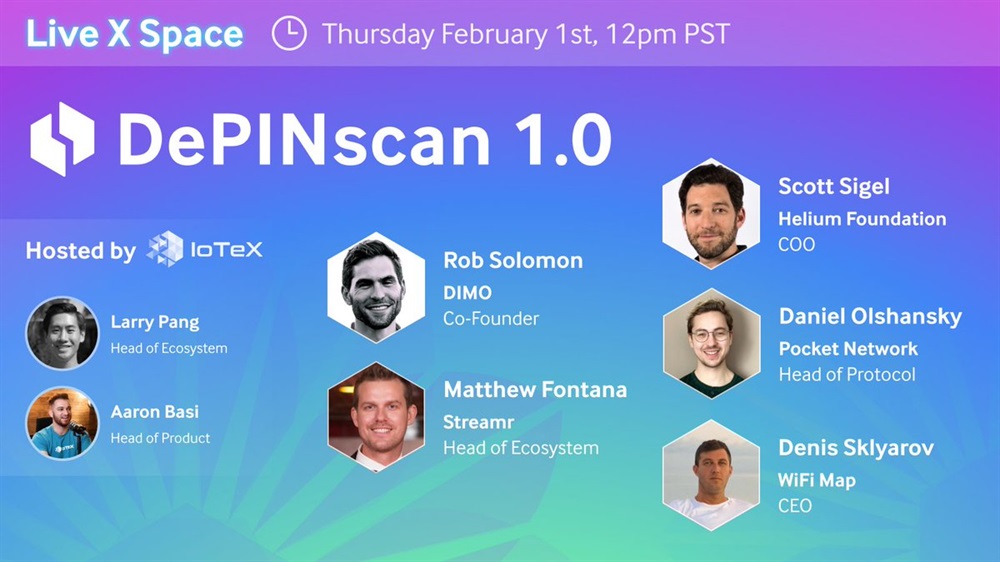 IoTeX will host an AMA on X on February 1st at 8 pm UTC. The discussion will involve DIMO, Helium, WiFi Map, Streamr Network, and Pocket Network. The main focus of the event will be the importance of transparent and trusted data for all DePIN projects and communities.