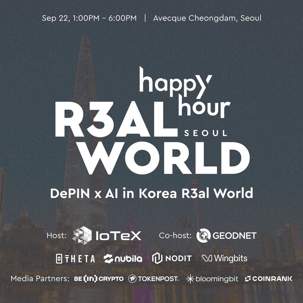 IoTeX will organize DePIN x AI: r3al meetup on September 22 in Seoul, as part of Korea Blockchain Week’s side events. The event will focus on innovation at the intersection of Web3, DePIN (Decentralized Physical Infrastructure Networks), and AI, bringing together builders, top Korean investors, and ecosystem partners, including Theta Network and Nubit. Registration is required due to limited spots.