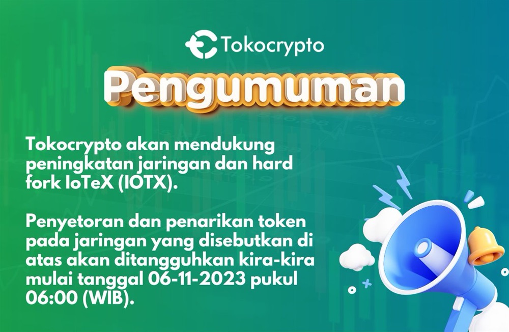 Tokocrypto akan mendukung peningkatan jaringan dan hard fork IoTeX (IOTX). Penyetoran dan penarikan token pada jaringan IOTX ditangguhkan pada 06-11-2023 pukul 06:00 (WIB).