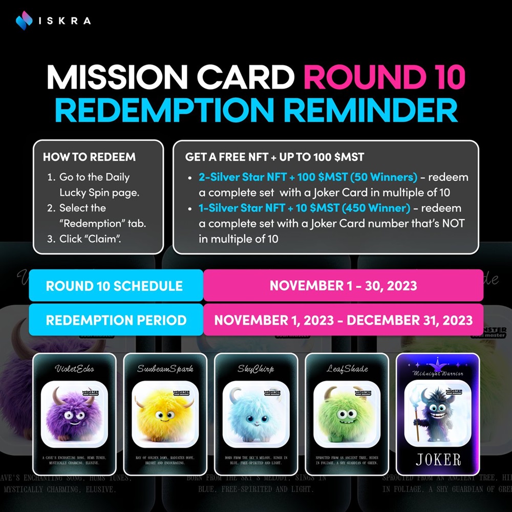 ISKRA Token is reminding its community about the redemption of mission card round 10 sets. This redemption offers the opportunity to receive a free NFT from Monster Soul Master and up to 100 MST tokens. The deadline for this redemption is set for December 31st.