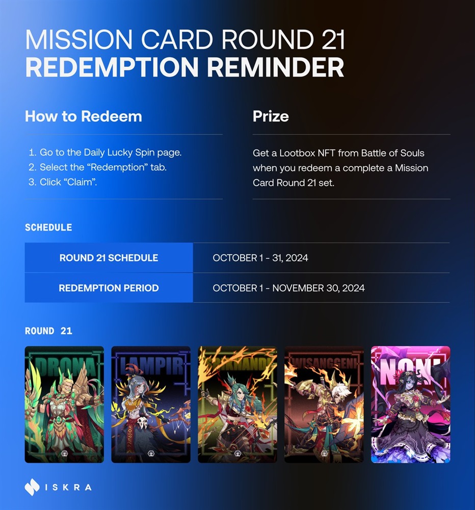 ISKRA Token has announced the approaching conclusion of the redemption period for the Mission Card Round 21 set, which offers the Lootbox NFT from Battle of Souls. The deadline for redemption is November 30th.