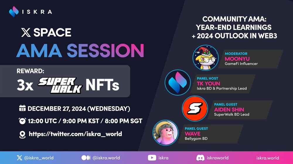 ISKRA Token will host an AMA on X in collaboration with Superwalk and Bellygom on December 27th at 12:00 UTC.