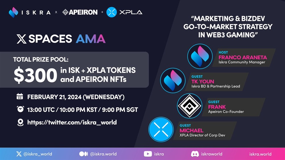 ISKRA Token will host an AMA on X with Apeiron and XPLA. The focus of the discussion will be on Web3 gaming. The event is scheduled to take place on February 21st at 13:00 UTC.