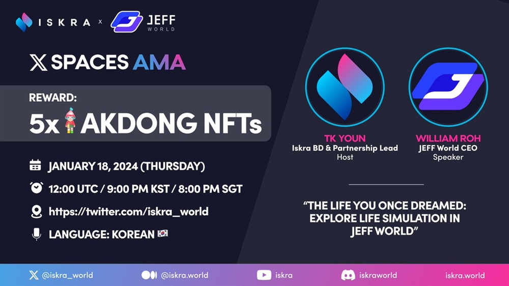 ISKRA Token will host an AMA on X on January 18th with JEFF World. During this session, there will be a giveaway where five participants will receive JEFF World AKDONG NFTs.