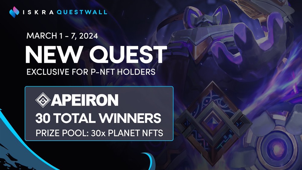ISKRA Token is collaborating with Apeiron for a 7-day quest exclusive to Planet NFT holders. The quest, which begins on March 1st, offers the opportunity to win one of 30 Planet NFTs.
