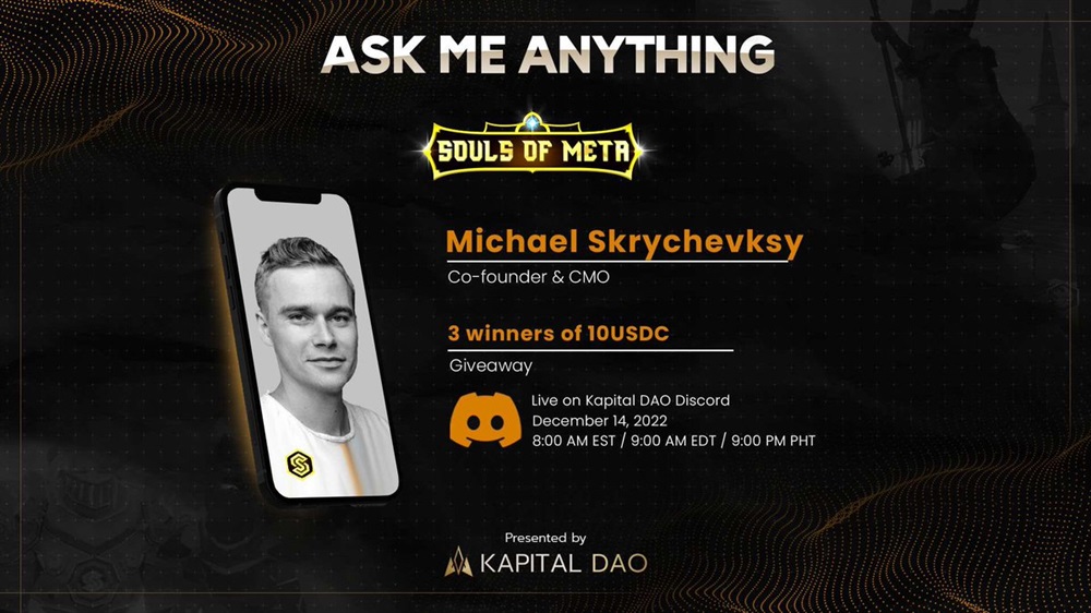 Uncover the mysteries of SoulVerse and join us for an AMA with @SoulsofMeta Co-founder, Michael Skrychevksy on December 14 at 8:00 AM EST / 9:00 PM PHT. Discover how you can have fun and earn through this free-2-play, Action-RPG Fantasy gaming metaverse only Kapital DAO’s server!